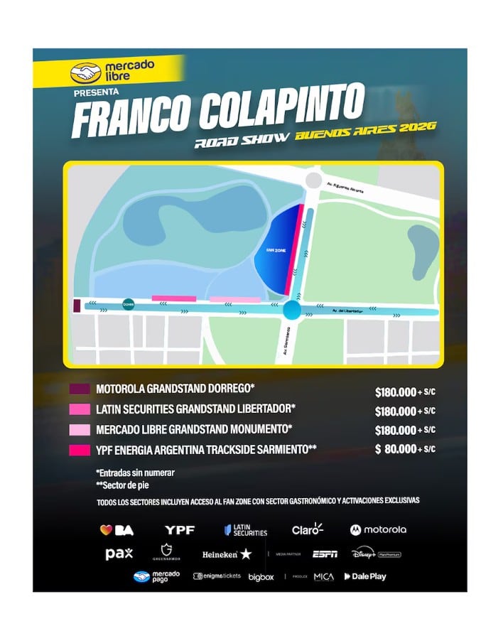 La venta general se iniciará el martes 7 de abril a las 16, con todos los medios de pago disponibles y a través del sitio oficial de Enigma Tickets. Los tickets se comercializan de forma online y contemplan tanto el acceso a tribunas como la participación en actividades del “Road Show”, incluyendo experiencias vinculadas a los boxes.